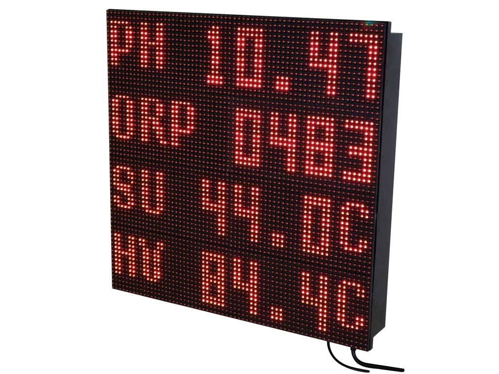 Pool Director” ‘den gelen bilgileri RS485 girişi aracılı¤ıyla alarak gösteren sayısal panolardır. Dört satır halinde pH, ORP, Havuz suyu sıcaklı¤ı, Hava sıcaklı¤ı (PANO I) + bilgisayar yardımıyla KAYAR YAZILI duyuru imkanı (PANO II). Hava sıcaklı¤ı sensörü pano üzerindedir. h=160 mm karekter ~60 m’den rahatlıkla okunur. Dış ortam kullanımına uygundur. Besleme gerilimi 220V AC’dir. Kayar yazı program bedeli fiyata dahildir.